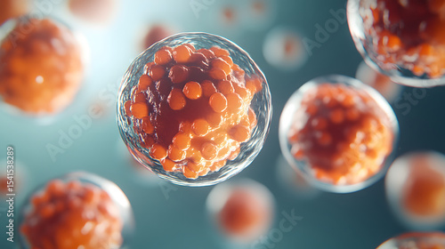 Fototapeta - Simple 3D rendering of stem cells with minimal details on a neutral background. Emphasizing cellular biology for cancer treatment research.