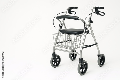 >Naklejka na meble>Aluminum rollator walker featuring adjustable handle and comfortable seat for improved mobility. concept of independence, elderly care, accessibility, copy space, white background