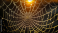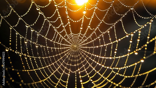 Close-up Backlit dew on spiderweb Intricate spiderweb covered in dewdrops, glowing intensely with golden sunset light, shallow depth of field, bokeh background, macro photography.