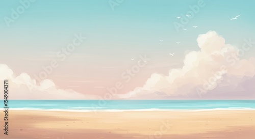 Serene Pastel Beachscape: Tranquil Ocean, Soft Clouds, and Gentle Sky