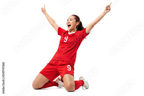 Fototapeta - Happy female soccer player celebrating goal in red uniform