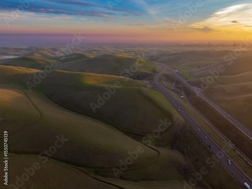 Fototapeta - Highway 580 cuts through rolling hills dotted with wind turbines at sunset in The Altamont Pass, Livermore, California, USA. Cars and trucks travel along the highway.