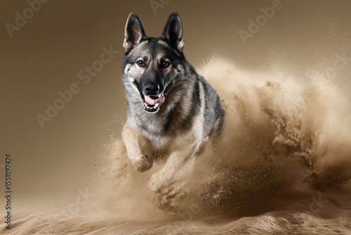 Owczarek niemiecki biegnący w piasku, Pies w ruchu na tle pustyn