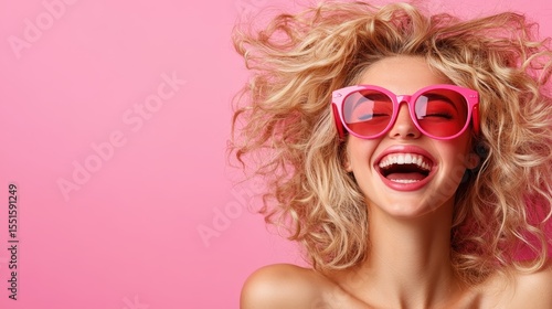 >Naklejka na meble>A vibrant woman radiates joy while wearing chic pink sunglasses, embodying a carefree spirit and youthful energy against a playful pink background.
