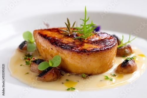 Fototapeta - Pan fried foie gras gourmet French cuisine on a white backdrop