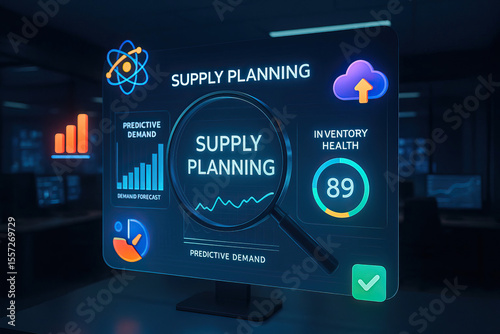 Fototapeta - Supply planning dashboard with predictive demand analytics, inventory health metrics, and demand forecast visualizations, interface enhances decision making in supply chain management