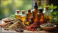 Fototapeta - Illustration of natural remedies for stress, anxiety. Adaptogenic herbs, essential oils, aromatherapy. Wooden table, glass bottles with oils, herbs. Chamomile, lavender, plants. Mental health,