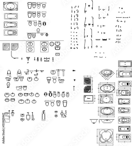 Fototapeta - 2D AutoCAD Bathroom Blocks – Toilet, Bathtub, Shower Faucet, Water Purifier, Urinary Tract Vector Design