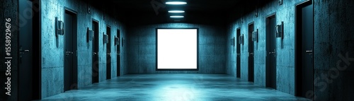 Fototapeta - A dimly lit corridor featuring many closed dark doors