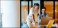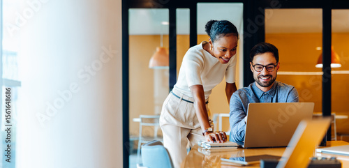 Smiling colleagues discussing project ideas while working on laptop at the office