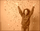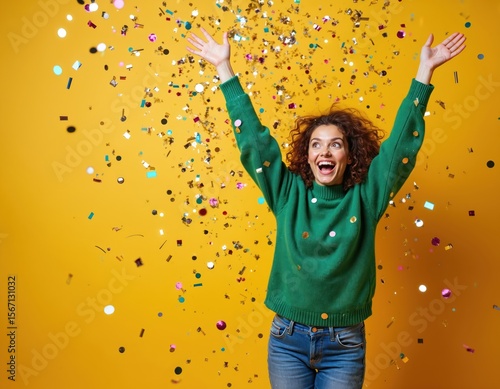 >Naklejka na meble>Excited woman celebrates big win shower of confetti on yellow background. Happy female expresses joy with arms up. Studio shot, one person, celebrating success.