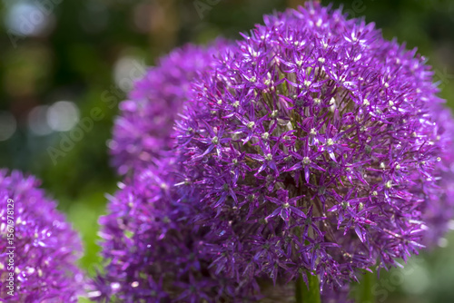 Fototapeta - Fioletowe kwiatostany ozdobnego czosnku (Allium species) ozdobione diamentami wiosennych kropel deszczu. Fioletowe kwiatostany w kształcie kuli pokryte są małymi, błyszczącymi kroplami wody.