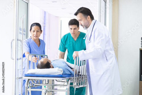 >Naklejka na meble>Hospital, healthcare, medical, doctor, nurse rush patient through corridor on emergency gurney, providing fast response and teamwork under pressure in critical situation, surgeon senior physician team