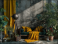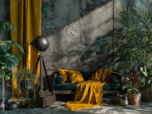 >Naklejka na meble>Aranżacja wnętrza z egzotycznym charakterem: zielona sofa z musztardowymi poduszkami i kocem, dopełniona licznymi roślinami. Surowa ściana z efektem betonu.