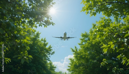 Fototapeta - Airplane flies overhead on a bright day framed by lush green trees. Symbolizing sustainable aviation and eco-friendly transport, showcasing innovation in green and future-forward transportation soluti