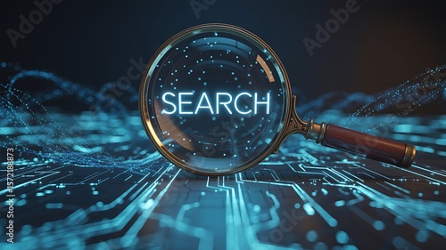 Magnifying glass with the word search glowing on a futuristic circuit board background