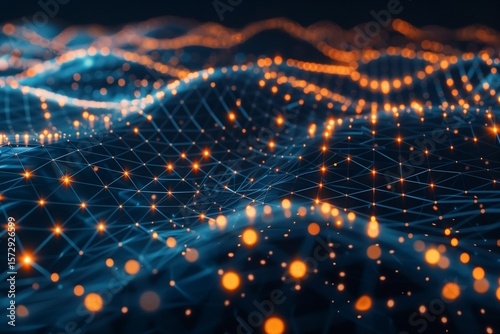 Abstract 3D grid with glowing data points and nodes, neural network concept, AI and machine learning data flow.