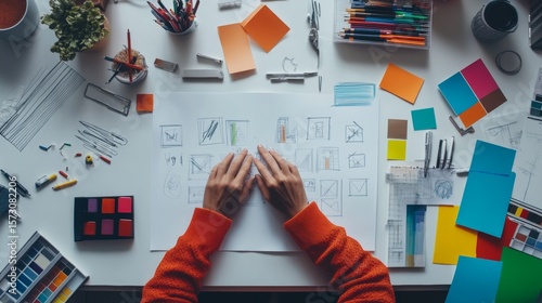 Fototapeta - Overhead view of a graphic designer's desk with hands working on sketches, surrounded by colorful stationery, digital tablet, and creative tools