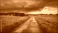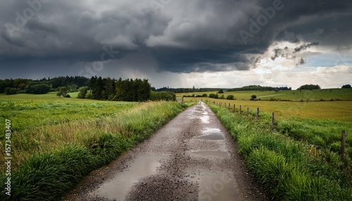 Fototapeta - rainy pathway in rural landscape with puddles and overcast sky