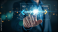 >Naklejka na meble>Change management concept. An executive's hand touches a holographic interface showing a process transitioning from an old to a new, optimized state.