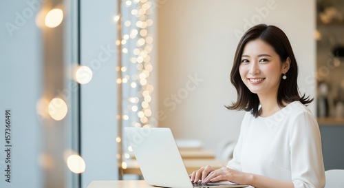 Fototapeta - カフェでノートパソコンを操作する笑顔の女性