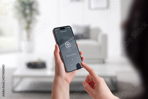 Fototapeta - Woman interacting with smart home interface on mobile phone in modern interior environment