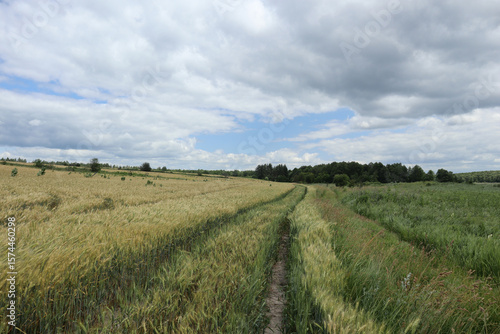 Fototapeta - A wide track path between a wheat field and tall grass, with a small pine forest on the horizon.