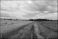 A wide track path between a wheat field and tall grass, with a small pine forest on the horizon.