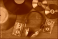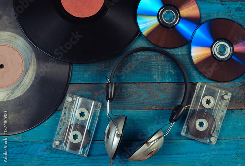 Vinyl records, CDs, audio cassettes, headphones are laid out on a blue wooden surface. Top view. 80s.