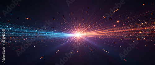 Fototapeta - abstract two lines from opposite side produce quantum lights with warm colors rays in the middle in dark purple background, tine particles spreading across the horizon clock wise style, dark and light
