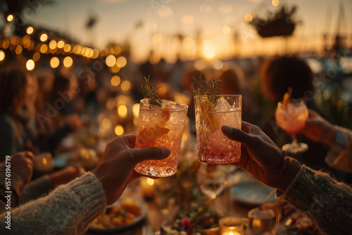 Fototapeta - Friends celebrate life with mocktails at sunset by the waterfront