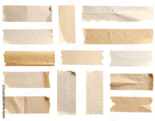 Fototapeta - Collection of old, ripped, and textured paper pieces with tape on a grunge wood background