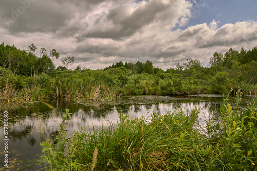 Fototapeta - Deszczowe i burzowe chmury nad starorzeczem doliny rzeki Noteć,Polska, Europa