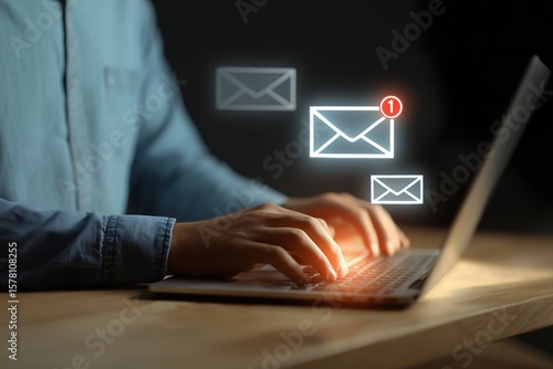 Fototapeta - Close-up of hands typing on a laptop keyboard, showing glowing digital email icons hovering above screen, concept for digital communication, online messaging, and electronic correspondence