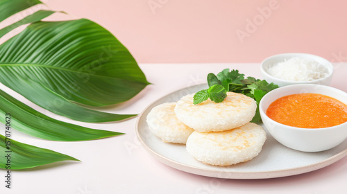Fototapeta - Delicious Thai khanom krok served with coconut, herbs, and vibrant dipping sauce, perfect for delightful snack or dessert