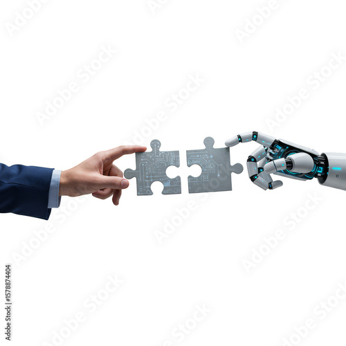 Fototapeta - 3D Render Human AI Hands Connect Silver Puzzle Transparent Background