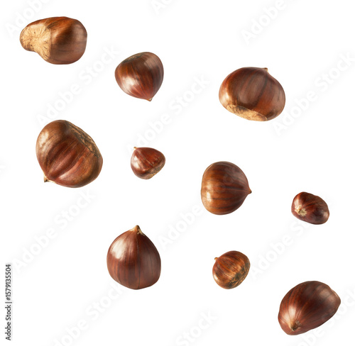 Fototapeta - Raw fresh Chestnut falling in the air solated on white background