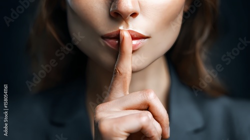 Fototapeta - A woman silently signals for quiet with her finger to her lips in a dark environment.