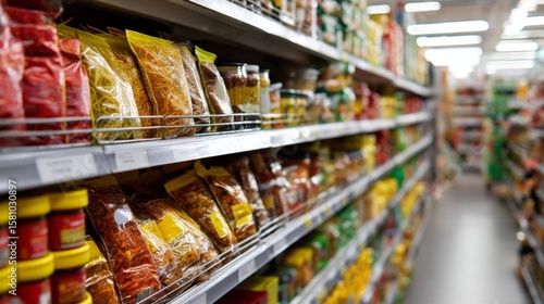 Fototapeta - Supermarket food aisle with packaged goods and bright lighting for retail commerce background photography concept