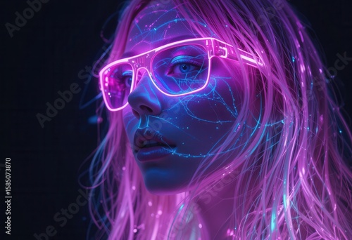 Futuristic woman with neon glasses glowing in the dark aesthetic portrait