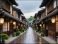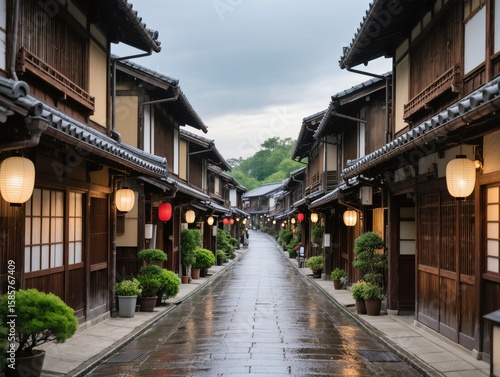 Traditional Japanese Street with Wooden Houses and Lanterns on a Rainy Day