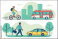 Illustration showing a cyclist, bus, pedestrian with briefcase and a car in an urban environment scene
