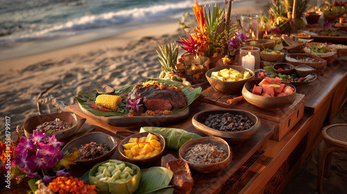 Fototapeta - Hawajski posiłek serwowany na plaży, z kolorowymi owocami, świeżymi rybami i tropikalnymi dodatkami. Idealne połączenie smaku i atmosfery wakacyjnego relaksu.