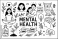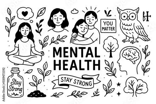 >Naklejka na meble>Mental Health Doodle Set, Hand Drawn Wellness and Self Care Icons, Therapy Mindfulness Positivity Support Illustration, Emotional Wellbeing Graphic Elements, Black White Transparent Background