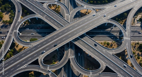 Fototapeta - Complex highway interchange viewed from above, showcasing numerous curving roads and moving vehicles.