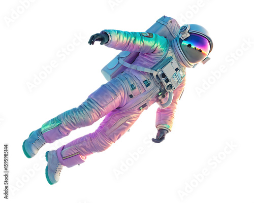 Fototapeta - Iridescent astronaut floating in space with a rainbow reflection in the helmet visor on black background