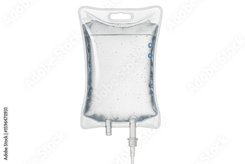 Medical iv drip bag hanging, delivering clear saline solution against transparent isolated background