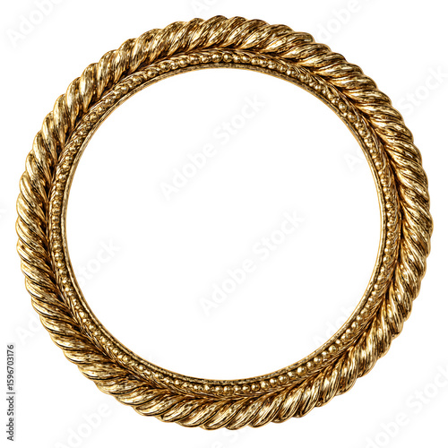 Vintage gold circular frame with twisted rope edging and dimensional highlights, angled slightly and isolated on transparent white background. --v 7.0 --s 250 --raw