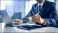 Businessman completes digital checklist on tablet with laptop, modern office setting
