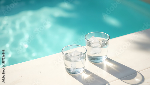 Fototapeta - 夏のプールサイドと氷水のグラス – 爽やかで開放的なライフスタイルを感じる風景 / Summer Poolside with Iced Water Glasses – Refreshing and Relaxing Lifestyle Scene